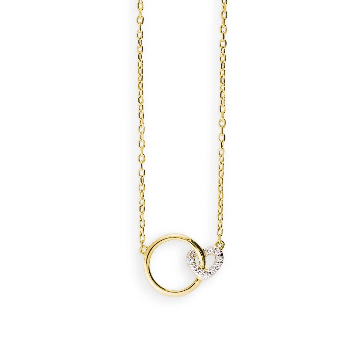 Der Anhänger besteht aus zwei ineinandergreifenden Ringen. Der größere Ring ist schlicht poliert, während der kleinere Ring filigran mit funkelnden Zirkonia-Steinen (alternativ: Diamanten) besetzt ist, die bei jeder Bewegung ein dezentes Lichtspiel erzeugen. Dieses Design macht die Kette zu einem idealen Schmuckstück für den Alltag, aber auch zu einem emotionalen Geschenk für Hochzeitstage, Verlobungen oder Geburten.